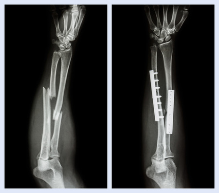 前腕の骨を骨折します それ運営されて 内部のプレートとスクリュー固定 左の画像 操作の前に右画像 操作後 の写真素材 画像素材 Image